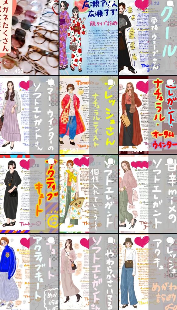 ①オンライン3種類診断(顔タイプ診断®、骨格診断、サイアートパーソナルカラー)&あなただけの診断結果アドバイスイラスト作成つき(1ヶ月間質問OK)